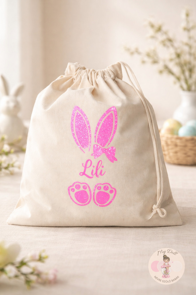 Névre szóló húsvéti vászon zsák rózsaszín -kicsi